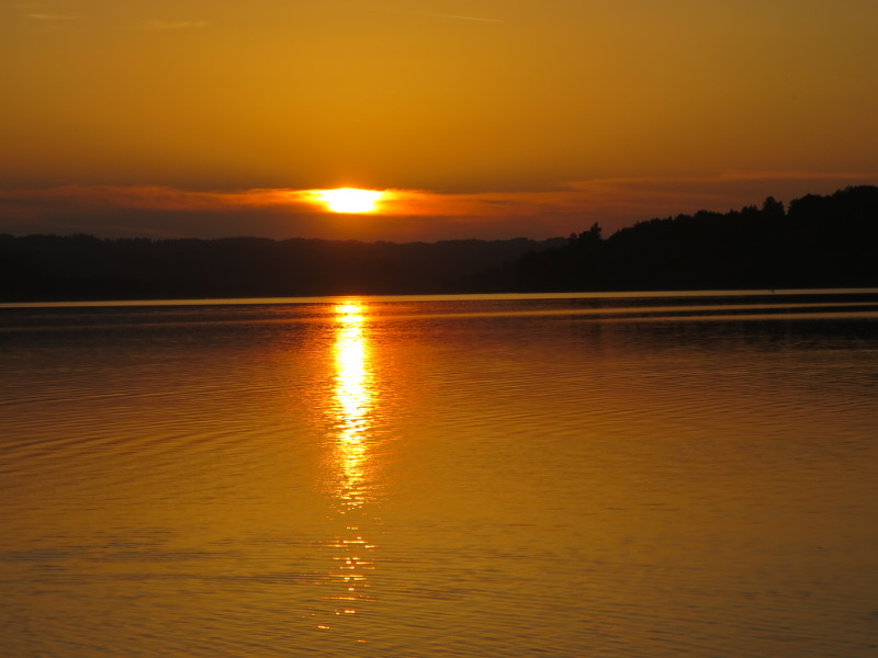 Glücklicherweise gab es in Uffing nichts, denn hier ist eindeutig mehr los und mehr zu sehen. Wir schlagen uns die Bäuche voll mit griechischem Essen und einer Ice-Cream-to-go, und machen uns auf den Weg zum Staffelseeufer. Wir finden eine freie Bank am Badestrand und beobachten, wie die Sonne im Wasser versinkt – zumindest hatten wir uns das so vorgestellt. Doch statt den See in blutrote Farbe zu tauchen, taucht die Sonne in einen Wolkenstreifen unter, der vorher nicht wahrzunehmen war. „Scheee“ ist es trotzdem.