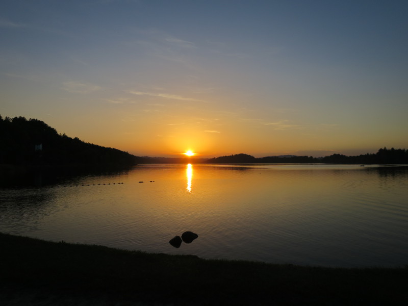 Unsere Zimmersuche in Uffing am Staffelsee bringt kein Ergebnis – zwei der Anbieter von Fremdenzimmern und Ferienwohnungen sind belegt, der Gasthof hat Ruhetag und das einzig verfügbare Zimmer weder Toilette noch Dusche. Beides ist zwar vorhanden, aber letzteres sogar ein Stockwerk tiefer. Das ist uns (hauptsächlich mir ;-) ) dann doch zu unkomfortabel, da wir nicht nur für eine Nacht bleiben wollen. In Murnau werden wir dann fündig und bekommen ein Zimmer im Hotel "Klausenhof" nahe der Innenstadt und nicht allzu weit vom Seeufer. Glücklicherweise gab es in Uffing nichts, denn hier ist eindeutig mehr los und mehr zu sehen. Wir schlagen uns die Bäuche voll mit griechischem Essen und einer Ice-Cream-to-go, und machen uns auf den Weg zum Staffelseeufer. Wir finden eine freie Bank am Badestrand und beobachten, wie die Sonne im Wasser versinkt – zumindest hatten wir uns das so vorgestellt. Doch statt den See in blutrote Farbe zu tauchen, taucht die Sonne in einen Wolkenstreifen unter, der vorher nicht wahrzunehmen war. „Scheee“ ist es trotzdem.