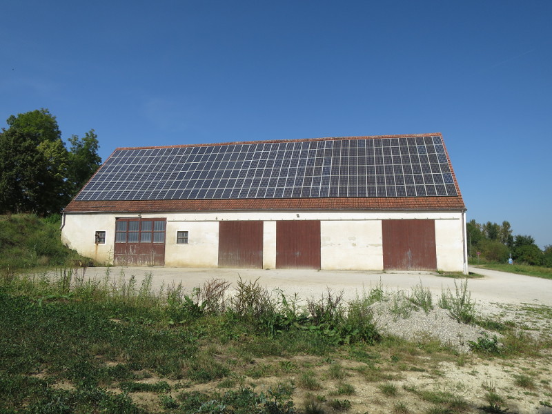 Unmittelbar daneben seht eine große Steinscheune mit massenweise Photovoltaik-Panels auf dem riesigen Dach. Wir werden ganz neidisch – sowas passt bei uns nicht auf die Terrassen-Pergola :-O